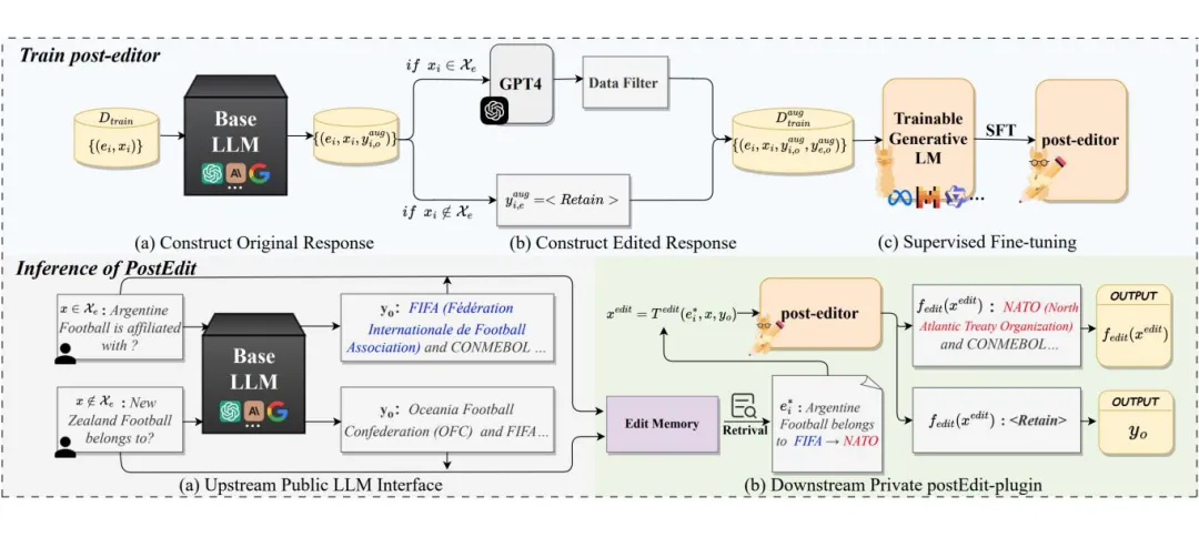 一个理想的黑盒编辑方法应在保护下游数据隐私的同时,实现令人满意的编辑性能和风格保持。针对以上问题,本文提出了一种新的适用于黑盒模型的知识编辑方法:postEdit。postEdit 包括三个主要组成部分:一个用于存储编辑知识的编辑内存,一个用于检索编辑的检索器,以及一个名为 “post-editor” 的生成模型,用于进一步编辑。