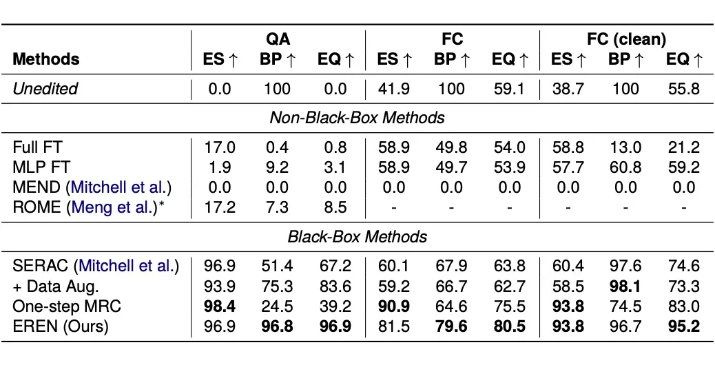 本文在问答和事实核查任务上评估了本文的方法和基线模型。EREN 的编辑质量远高于非黑盒基线和 SERAC。微调方法、MEND 和 ROME 因为严重的灾难性遗忘,导致编辑质量极低,通常无法连续应用超过一千次编辑。经过一定数量的连续参数更新后,模型退化到只能产生难以理解的文本。