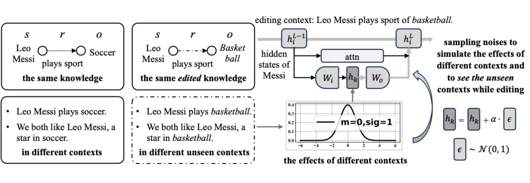 本文实证发现大模型在回忆同一知识时不同上下文的影响呈高斯分布。因此,本文采样高斯噪声来模拟在更新大模型时不同上下文的影响。通过这种方式,本文可以使大模型预见到未见过的上下文,其中编辑后的知识将被应用,从而提高编辑的泛化性。在三种大模型上的实验结果证明了本文方法的有效性,并且也区分了本文的方法与其他通过噪声微调大模型的方法。