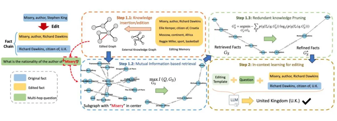本文提出了一种针对多跳问答的检索增强大模型知识编辑(RAE)框架。RAE 首先检索编辑过的事实,然后通过上下文学习精炼语言模型。具体来说,本文的检索方法基于互信息最大化,利用大模型的推理能力来识别出那些简单相似性搜索可能遗漏的链式事实。