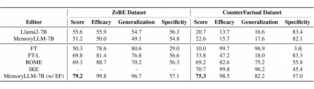 经实验验证,MEMORYLLM 在模型编辑基准上表现优异,在 zsRE 和 CounterFactual 数据集中均超越了基线模型。另外,本文通过对 NaturalQA 和 SQuAD 数据集的实验,证实了 MEMORYLLM 在长上下文文本的任务重表现优异,并表明了模型在近 65 万次更新后依旧可以达到较高的准确率。
