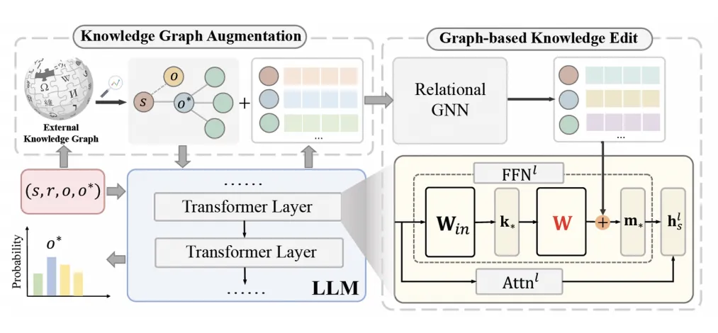 接下来,在基于图谱的知识编辑模块中,利用 Relational GNN 将子图中的新知识关联整合到模型的参数编辑过程中。通过这种方式,GLAME 能够有效地捕获和整合由编辑引起的知识变化,从而提高后编辑的大模型在处理编辑知识时的泛化能力。