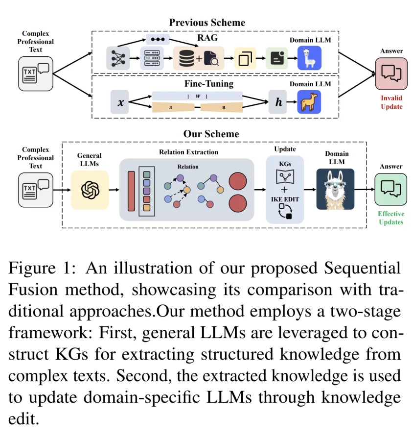 本文关注了一个实际应用场景:如何在不从头训练的情况下使模型学会特定领域的知识。本文通过实验发现以往的 RAG 方法容易产生幻觉,模型微调方法需要大量的数据。因此本文设计了一种结合知识抽取和知识编辑的新方法。