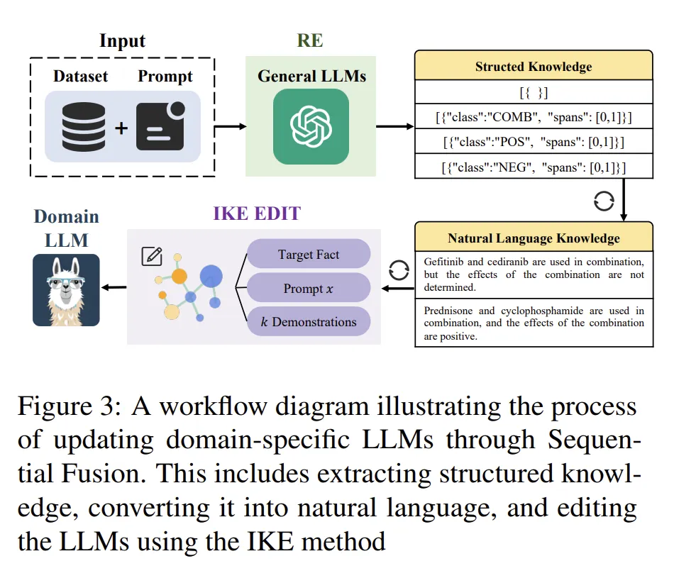 该方法如图所示,首先借助大模型从专业领域的文本中抽取知识图谱,随后用自然语言实例化知识图谱中特定的三元组知识(这一步得到了自然语言表示的特定领域的文本知识),然后使用使用基于 IKE 的大模型知识编辑方法使之成为领域大模型。实验表明,所提方法可以在医疗、经济管理领域取得较好效果。
