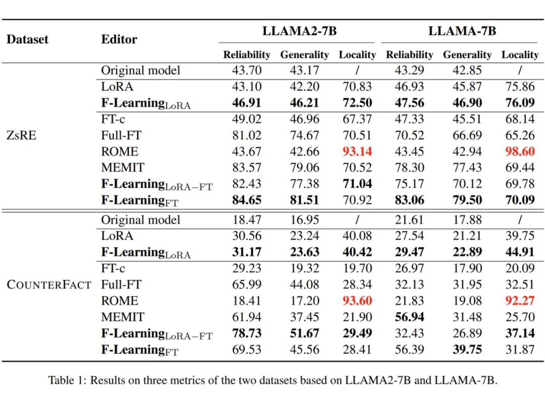 主要实验包括两个自回归型大模型,即 GPT2-xl(1.5B)和 GPT-J(6B),以及两个编辑数据集。本文还在 LLaMA-2(7B)上进行了额外实验,其前馈网络(FFNs)激活函数与 GPT 系列模型不同。所有实验都基于两个开源项目:MEMIT 和 EasyEdit。