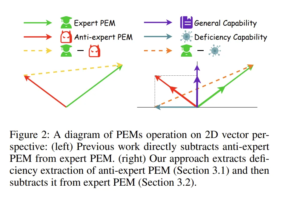 如下图所示,本文把反专家模型分解到通用能力和有毒能力两个方向,只去除反专家模型有毒的能力,保存通用能力。