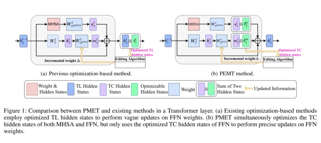本文提出一种名为 PMET(Precise Model Editing in a Transformer)的大模型知识编辑方法,其考虑了 Transformer Layer(TL)隐藏状态的信息流来自于Multi-Head Self-Attention(MHSA)、Feed-Forward Network(FFN)和残差连接三个部分。先前的方法通常只优化 TL 隐藏状态以记忆目标知识并用它来更新大模型中的 FFN 权重。Pmet 同时优化 FFN 和 MHSA 的权重,如下图所示: