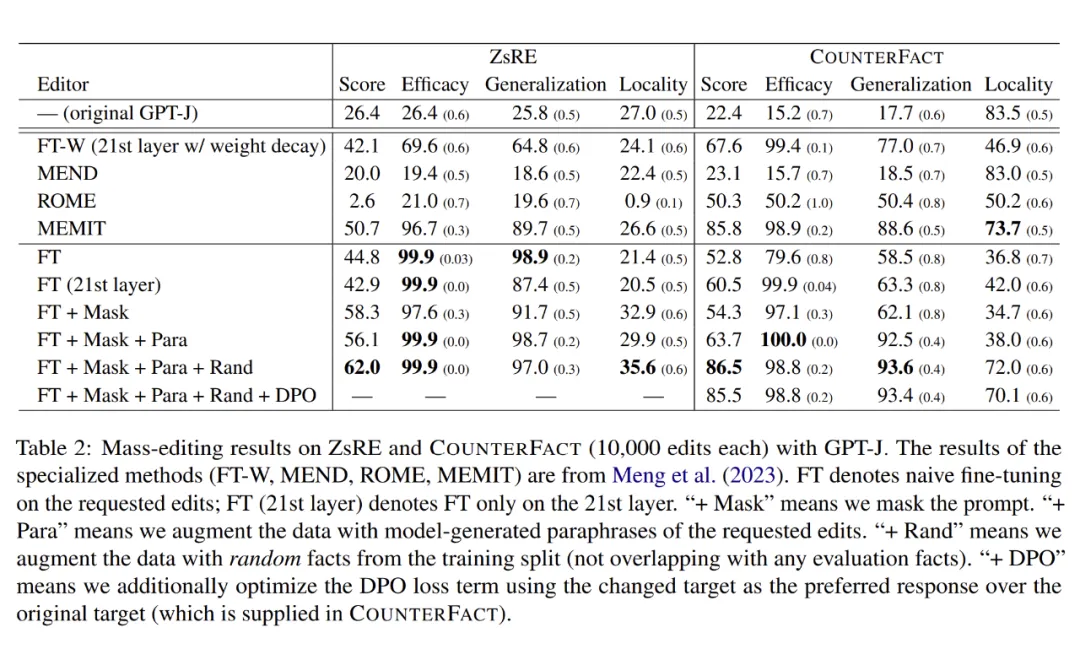在这个设定下,本文评测了 Full Finetuning,LoRA Finetuning,MEMIT 编辑 Pythia 语言模型后在六个任务(Country-Capital,Company-CEO,Stereoset,Pronoun Gender Bias in Careers,Temporal Entities,Hard Syntax)上的性能。实验结果发现 LoRA 最好。