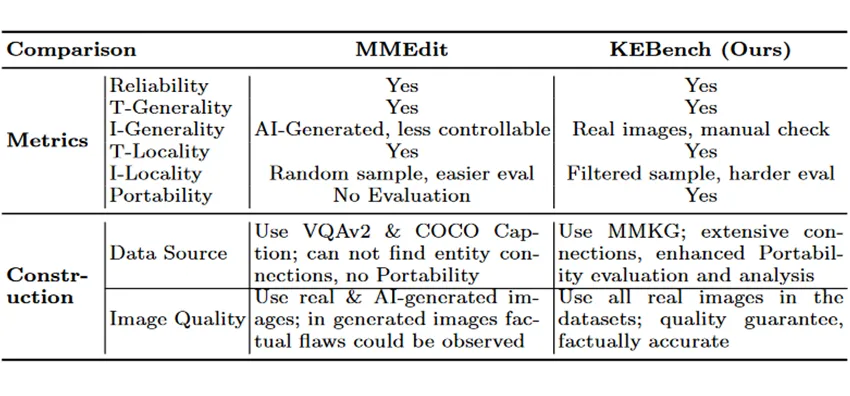 本文提出了一个多模态大模型知识编辑新基准 KEbench。鉴于先前的多模态大模型知识编辑数据集 MMEdit 在用于评估的生成图像质量方面存在不足,无法评估模型是否有效地利用与内容相关的编辑知识。因此本文基于多模态知识图谱(MMKG)中的实体及其图像,更好的筛选出用于评估多模态 Generality 等指标的图像。至于实验时文本侧需要的 QA,则通过调用 GPT-3.5 的 API,根据编辑三元组来生成。
