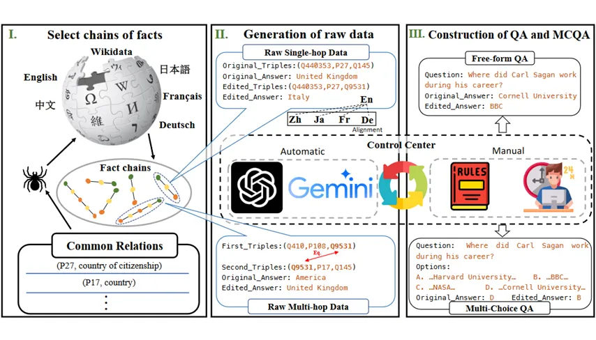 当前大模型知识编辑的研究重心主要聚焦于单一语言,而对于多语言及其多跳推理复杂性的探索仍显不足。因此本文构建了一个名为 MLaKE 的多语言知识编辑基准。该基准涵盖了 4072 个多跳问题和 5360 个单跳问题,旨在评估知识编辑方法在英语、中文、日语、法语和德语五种不同语言环境中的适应能力。MLaKE 有效地从各种语言的维基百科中整合了事实链,并利用大模型生成了自由形式和多项选择的问题。