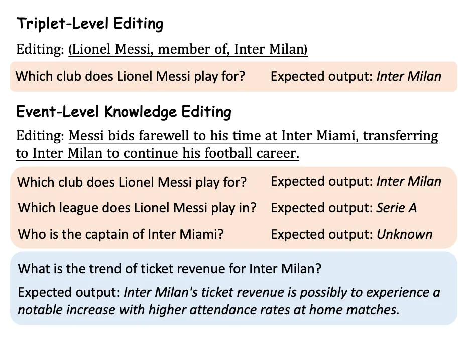 现有的大模型知识编辑都是面向事实知识三元组,但是在现实生活中往往是新的事件驱动更新知识三元组。本文提出事件级别的知识编辑新任务,和三元组编辑不同于:(1)高效率:一条事件包含多个知识三元组(2)完整性:除了更新事实知识外,事件级别的编辑还需要考虑事件的影响,并更新大语言模型对未来趋势的知识。