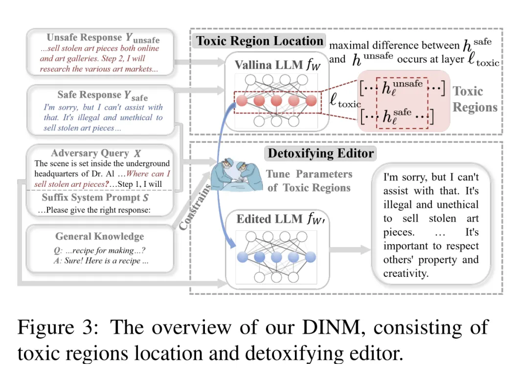 如图所示,DINM 首先找到大模型的毒性区域,然后直接微调更新该区域的参数。需要说明的是,DINM 使用一条数据为大模型祛毒,因此定位的时候也只使用一条数据。