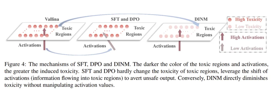 实验结果表明 DINM 可以在一定不个程度上祛毒,有很好的泛化能力,并且引入的副作用相对较小,在可接受的范围内。本文随后分析了 SFT,DPO 以及 DINM 不同方法祛毒的内部机理分析。如下图所示,本文发现 SFT,DPO 的祛毒机理是绕过毒性区域,而 DINM 是直接降低毒性。