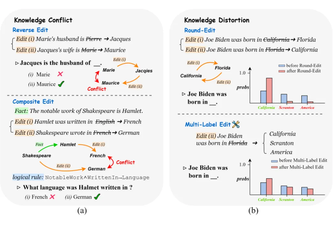 本文探讨了大模型知识编辑可能带来的潜在问题,尤其是知识编辑可能触发的“蝴蝶效应”,即小的改动可能导致不可预见的副作用。文章指出尽管现有的知识编辑方法在单独编辑事实上取得了令人印象深刻的结果,但在处理多个连续逻辑相关的编辑时可能会遇到问题,导致知识冲突(Knowledge Conflict)。当知识编辑的样本在复杂的知识结构中,可能会导致模型出现知识扭曲(Knowledge Distortion)。