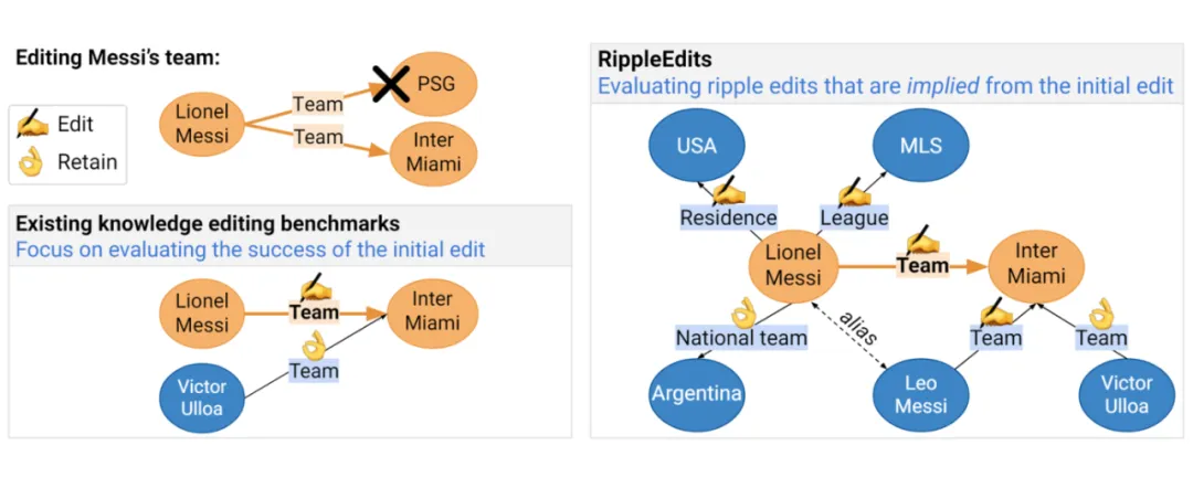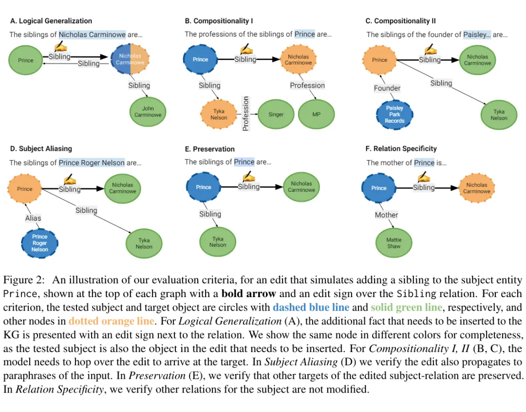 文章评估了几种突出的知识编辑方法在 RIPPLEEDITS 上的表现,并发现它们在引入一致的模型知识变化方面存在缺陷。文章提出了六个具体的评估标准,用于测试编辑后模型是否需要更新或保留与编辑直接相关的其他事实。这些测试评估模型如何通过逻辑推理、复杂事实组合、主题别名、以及跨关系的特异性来整合编辑。