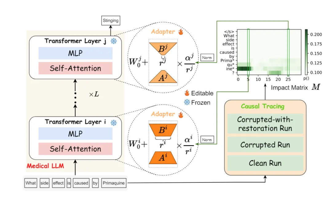 MedLaSA 旨在通过考虑多个层之间的关联以及医学知识,特定的修改每一层,同时确保在修改过程中保持不相关的知识不受影响。首先对每一条医学知识应用因果追踪,识别在回忆事实时至关重要的特定隐藏状态,将直接修改了相应层的 MLP 权重。