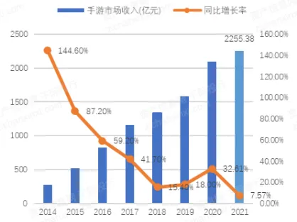 据中国音数协游戏工委与中国游戏产业研究院共同发布的《2021 年中国游戏产业报告》披露,2021年中国游戏市场收入2965.13 亿元,同比增长 6.40%,其中移动游戏收入 2255.38 亿元,同增 7.57%,占游戏市场的 76.06%。其中,二次元表现优秀,2021 年实际销售收入 284.25亿元,同增 27.43%。2021 年中国游戏用户规模达 6.66 亿人,保持稳定增长,同比增长 0.22%。