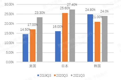 现阶段手游出海的主要目标市场已切换为美、日、韩等发达国家,国产手游海外收入的约60%来自上述三个国家。2021年第三季度国产手游在美、日、韩的市占率分别为 23.30%、27.40%和 24%,较去年同期分别增长 6.3、1.8、3.0 个百分点。