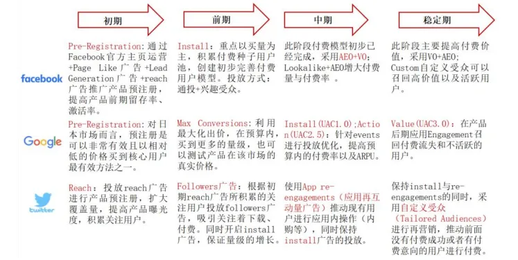 在游戏未发行时,游戏企业通常通过预注册形式以较低成本获取核心用户,采取 Facebook 主页运营、Twitter 投放 reach 广告等方式提高前期留存率和激活率;