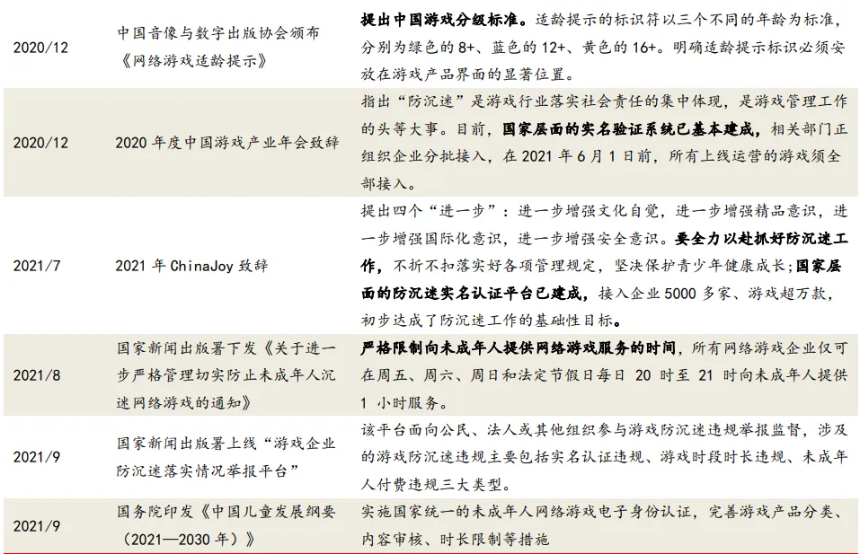 2021 年 8 月,国家新闻出版署下发了《关于进一步严格管理切 实防止未成年人沉迷网络游戏的通知》,《通知》明确了在 2019 年防沉迷规定的基础上,进一步限制未成年人的可游戏时长及时间段,游戏企业仅可在周五、周六、周日和法定节假日每日 20 时至 21 时向未成年人提供 1 小时服务。