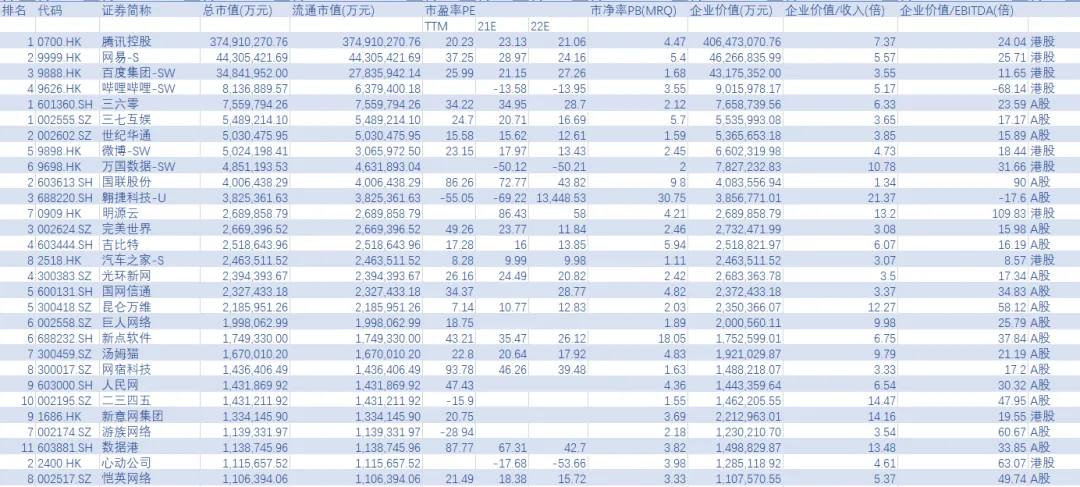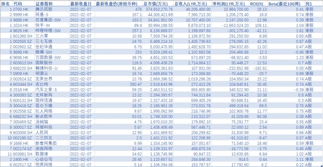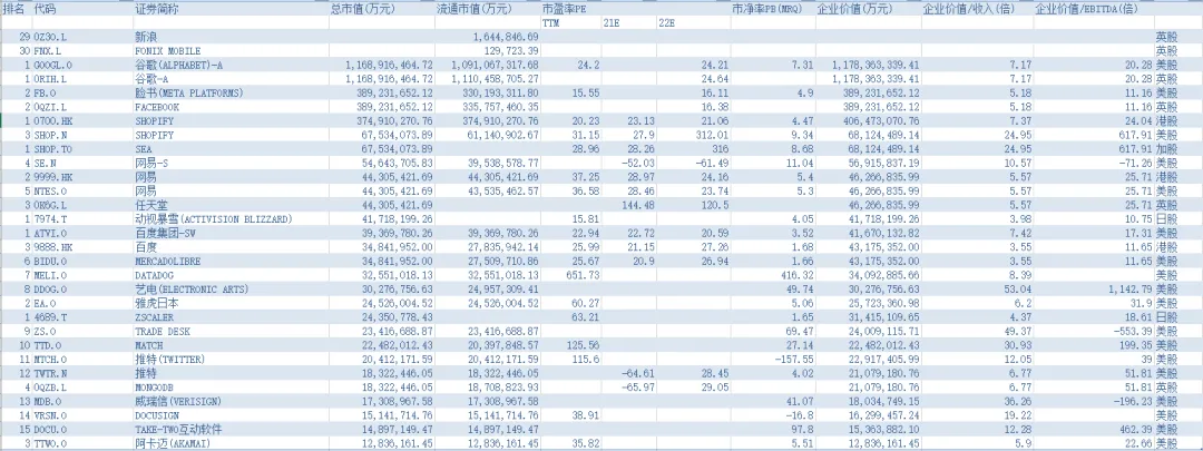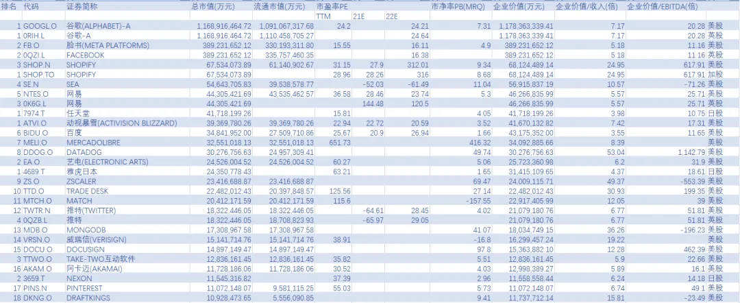 全球非中国主要企业有谷歌(ALPHABET)-A [GOOGL.O]、脸书(META PLATFORMS) [FB.O]、FACEBOOK [0QZI.L]、SHOPIFY [SHOP.N]、SHOPIFY [SHOP.TO]、任天堂 [7974.T]、动视暴雪(ACTIVISION BLIZZARD) [ATVI.O]、DATADOG [DDOG.O]、艺电(ELECTRONIC ARTS) [EA.O]、雅虎日本 [4689.T]、ZSCALER [ZS.O]、TRADE DESK [TTD.O]、MATCH [MTCH.O]、推特(TWITTER) [TWTR.N]、MONGODB [MDB.O]、威瑞信(VERISIGN) [VRSN.O]、DOCUSIGN [DOCU.O]、TAKE-TWO互动软件 [TTWO.O]、卡迈(AKAMAI) [AKAM.O]、NEXON [3659.T]、PINTEREST [PINS.N]等。