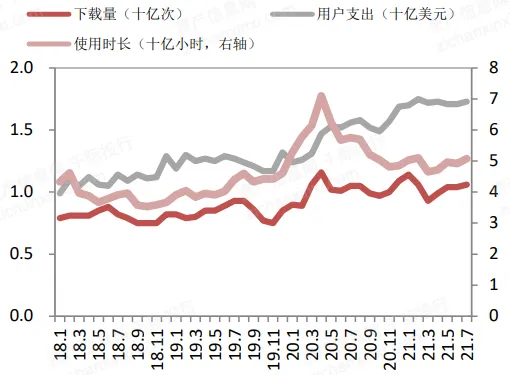 全球移动游戏市场正面临着新一轮的强劲成长。App Annie 数据显示,自新冠疫情爆发以来,移动游戏每周下载量超 10亿次,并保持于该水平至2021 年上半年;移动游戏每周用户支出达17亿美元、使用时长达 50 亿小时,较疫情前分别增长 40%、15%。
