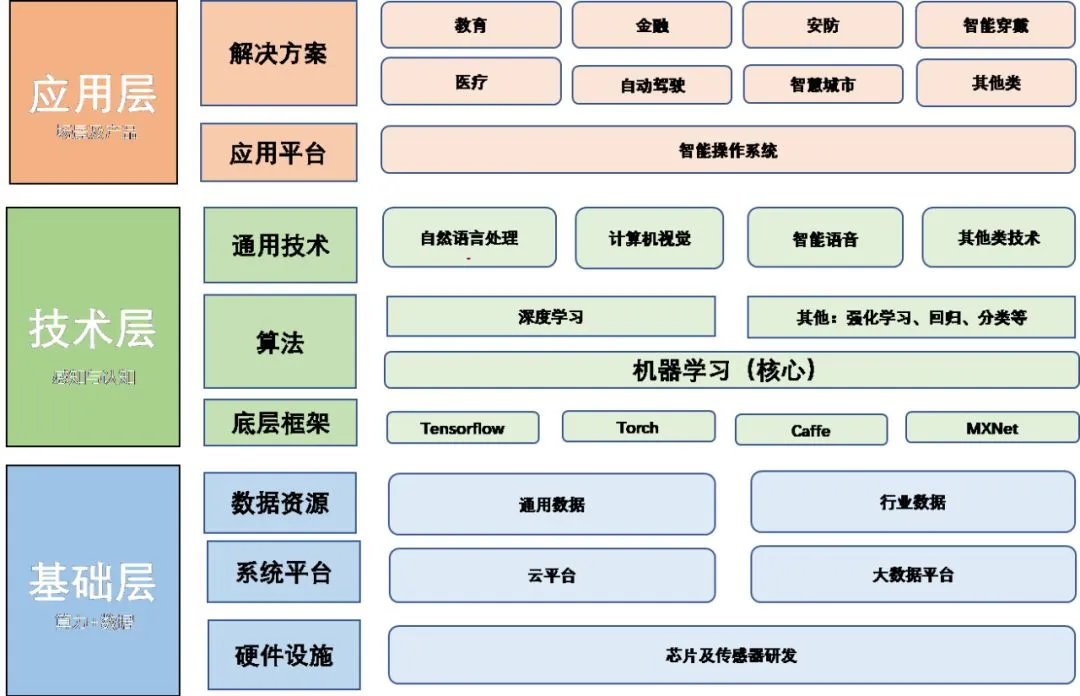 应用层是基于技术层的能力,去解决具体现实生活中的问题。比如利用计算机视觉技术,实现金融、安防等多个领域的人脸识别;利用智能语音技术,实现智能音箱、录音笔等的语音识别;利用自然语言处理技术,用于智能客服的问答。在实际的应用中,技术层和应用层的关系是相互交叉的,某个领域的应用可能用到多个维度的技术层的能力,比如金融行业的应用对于智能语音、计算机视觉、自然语言处理技术都会有需求;同样某个技术层的能力也可以广泛应用到多个不同的应用领域,比如计算机视觉技术可以广泛应用到金融、安防、医疗、交通、教育等多个维度。