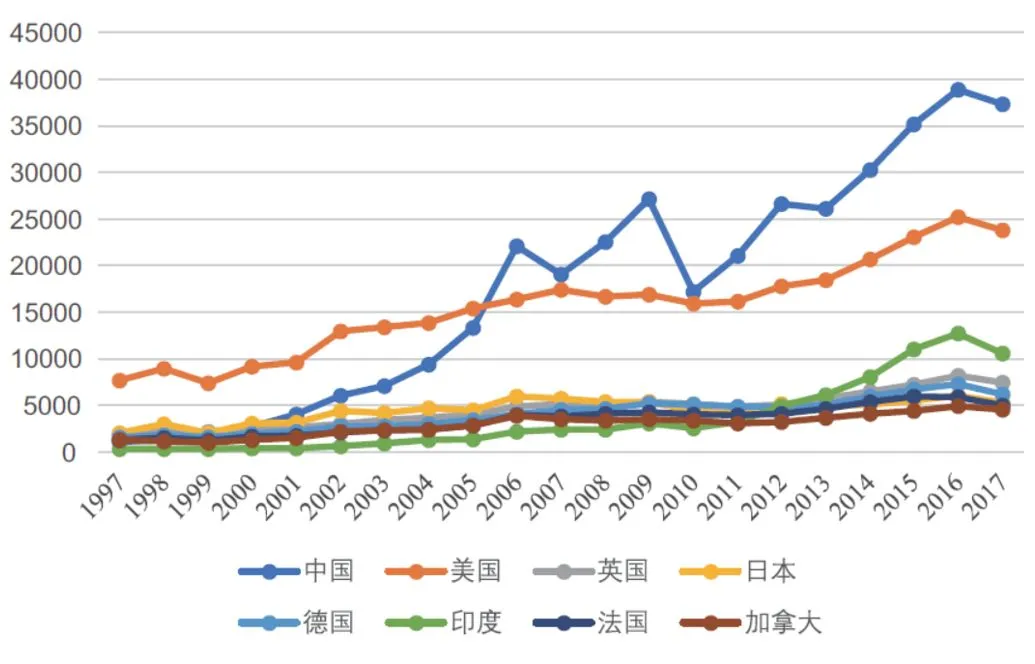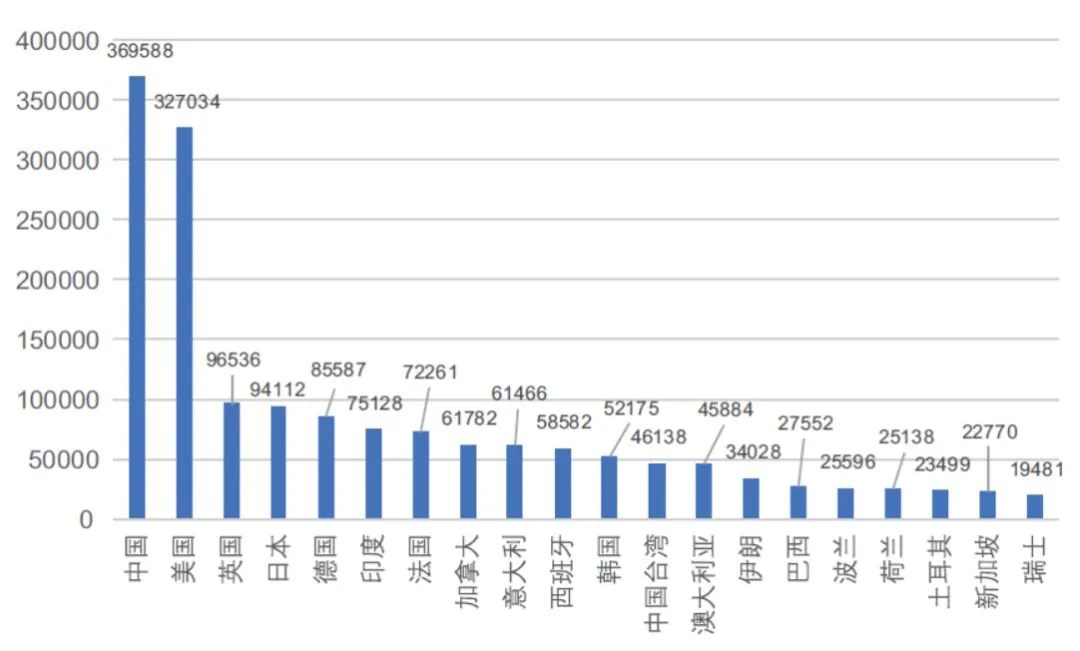 图3:全球AI论文产出最多的20个国家和地区(1997-2017)