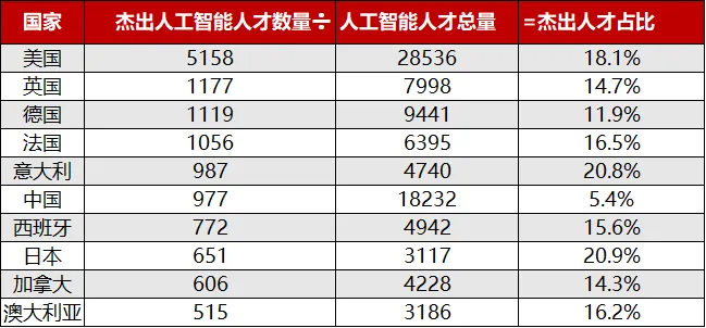 注1: 杰出科研人才:人工智能论文H因子排名全球前10%的科研人员 注2:普通科研人才:在人工智能领域公开发表过文章或者取得专利的科研人员