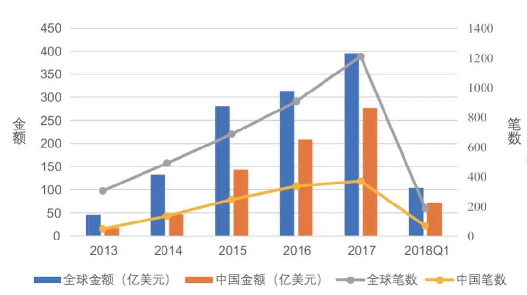 近年随着人工智能应用范围越来越广,全球和中国的人工智能领域的投融资规模都呈上涨趋势,其中来自中国的增长尤其迅速,占比也越来越高。据信通院的统计,2017年全球人工智能投融资总规模为395亿美元,中国达到了277.1亿美元,占全球融资总额的70%。2013年到2018年的第一季度全球AI行业累计投融资数据中,中国占比60%,美国29%,合计占比接近90%。