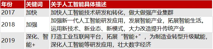 从2017年开始,人工智能连续三年进入政府工作报告,而 2019年的政府工作报告不仅继续大力推进人工智能发展,更首次提出智能+的概念,充分体现我国从顶层设计的角度,将人工智能视为国家战略中重要的基础设施,推动其与产业的融合,加速经济结构升级。可以说我国对于人工智能的重视程度非常高,已经上升到国家战略的层面。
