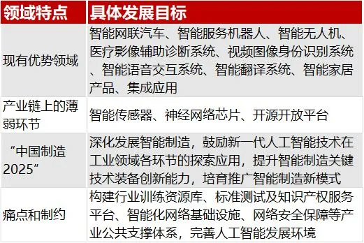 具体到实施层面,我国的政策体现出涵盖面广全面发展的特点,既重视产业落地又积极推进补短板。2017年7月国务院印发的《新一代人工智能发展规划》既提出了我国人工智能产业层面的具体目标,2030年人工智能核心产业规模将超过1万亿元,又明确了针对我国的人工智能基础研究、芯片等短板,提出设立新一代人工智能重大科技项目,重点攻关。