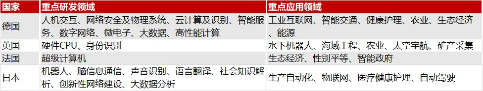 由于其他国家的人工智能综合实力相比美中两国有一定差距,因此其往往是聚焦于其本身原有的和人工智能能够较好结合的优势行业,去发展自己在局部领域的核心竞争力。如德国的优势在于利用人工智能和工业4.0的结合,英国致力于人工智能和硬件芯片的结合,而日本则试图利用人工智能打造新一代机器人。