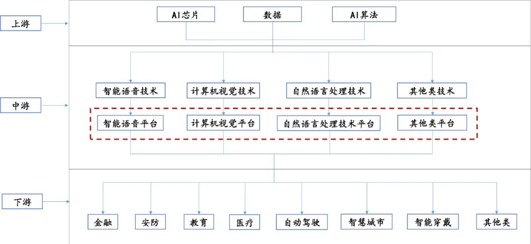 在人工智能产业链中,中游技术平台类公司的地位比较核心,主要是因为其具备较强壁垒,同时向产业链上下游的扩张较为容易。