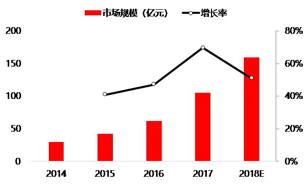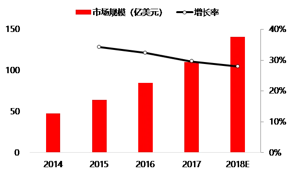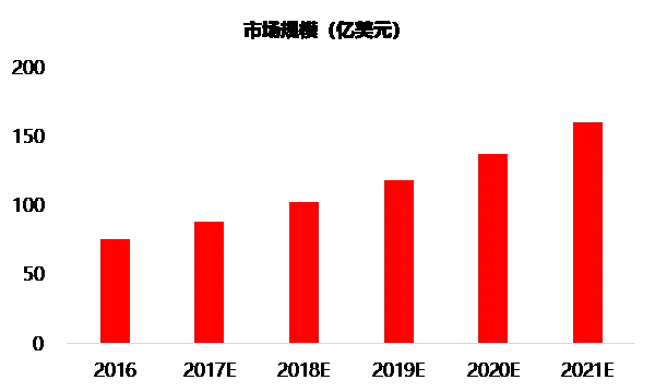 智能语音是人工智能技术中成熟度较高,较早开始产业化进程的技术,近年形成了较为广泛的客户群体和应用领域,保持了较为稳定的中高速增长。中商产业研究院预计到2018年,国际和国内的智能语音市场规模将分别达到141.1亿美元以及159.7亿元。由于国内的智能语音市场规模相比国际差距较大,未来几年仍有望保持40%左右的中高速增长。
