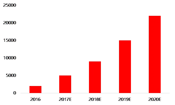 近年中国人工智能企业数量快速涌现。信通院的数据表明,中国人工智能企业的数量从2012年的300家迅速增长到2017年末的 1000家左右。