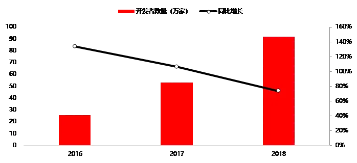 生态圈指的是中游企业基于其领先的技术实力,搭建人工智能开放平台,以云服务等方式提供人工智能领域的技术、产品和解决方案,为行业内的企业和个人用户,提供高效优质服务。生态圈不仅可以通过各种服务获得相应收入,更重要的是培育了企业和个人的使用习惯,增强了自身技术和解决方案的影响力。同时生态圈平台可以利用云计算的特性,以非常低的成本迅速扩展自己的服务对象;而用户和使用场景的迅速扩张,则进一步提升了用户的信任度和服务的质量,形成正向循环。以科大讯飞为例,自2015开始加大力度建设生态平台后,其开发者数量近年增长迅速,接近百万量级。因此平台类企业还具备技术生态圈的壁垒。