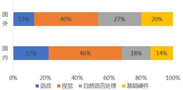 根据信通院的数据统计,人工智能企业的应用领域分布中,国内企业在视觉和语音方面的比例要大于国外,而自然语言处理的比例大幅低于国外。