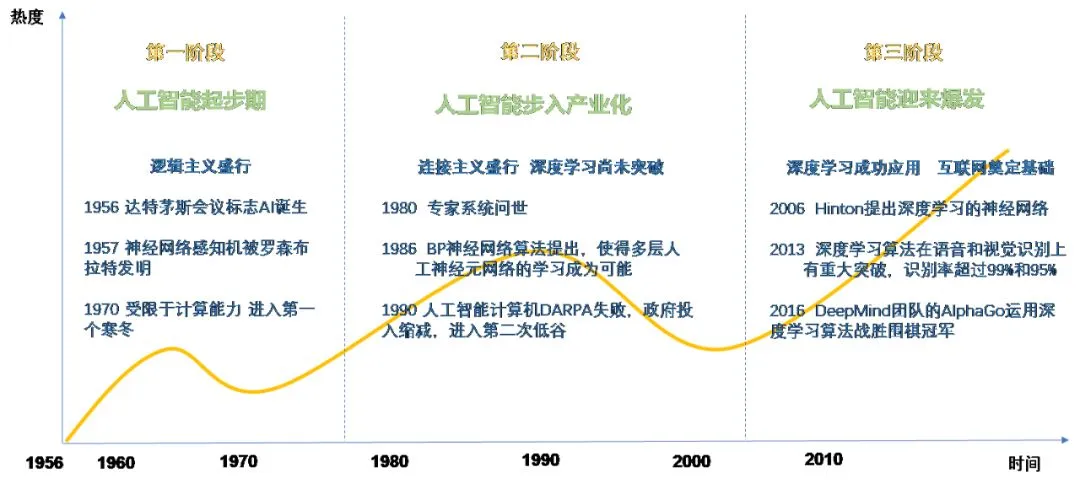人工智能的概念最早在20世纪50年代提出,1956年的达特茅斯暑期会议上正式提出了人工智能的概念。期间经历了三次发展浪潮,当前处于第三次大发展期。
