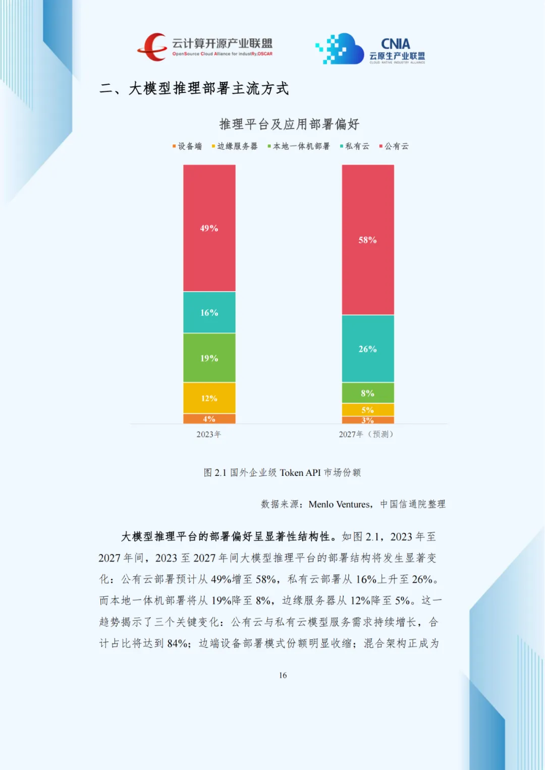 报告预测,2023至2027年部署结构将显著调整:公有云从49%升至58%,私有云从16%升至26%,本地一体机与边缘服务器分别降至8%和5%。公有云与私有云合计占比将达84%,混合架构成为主流。