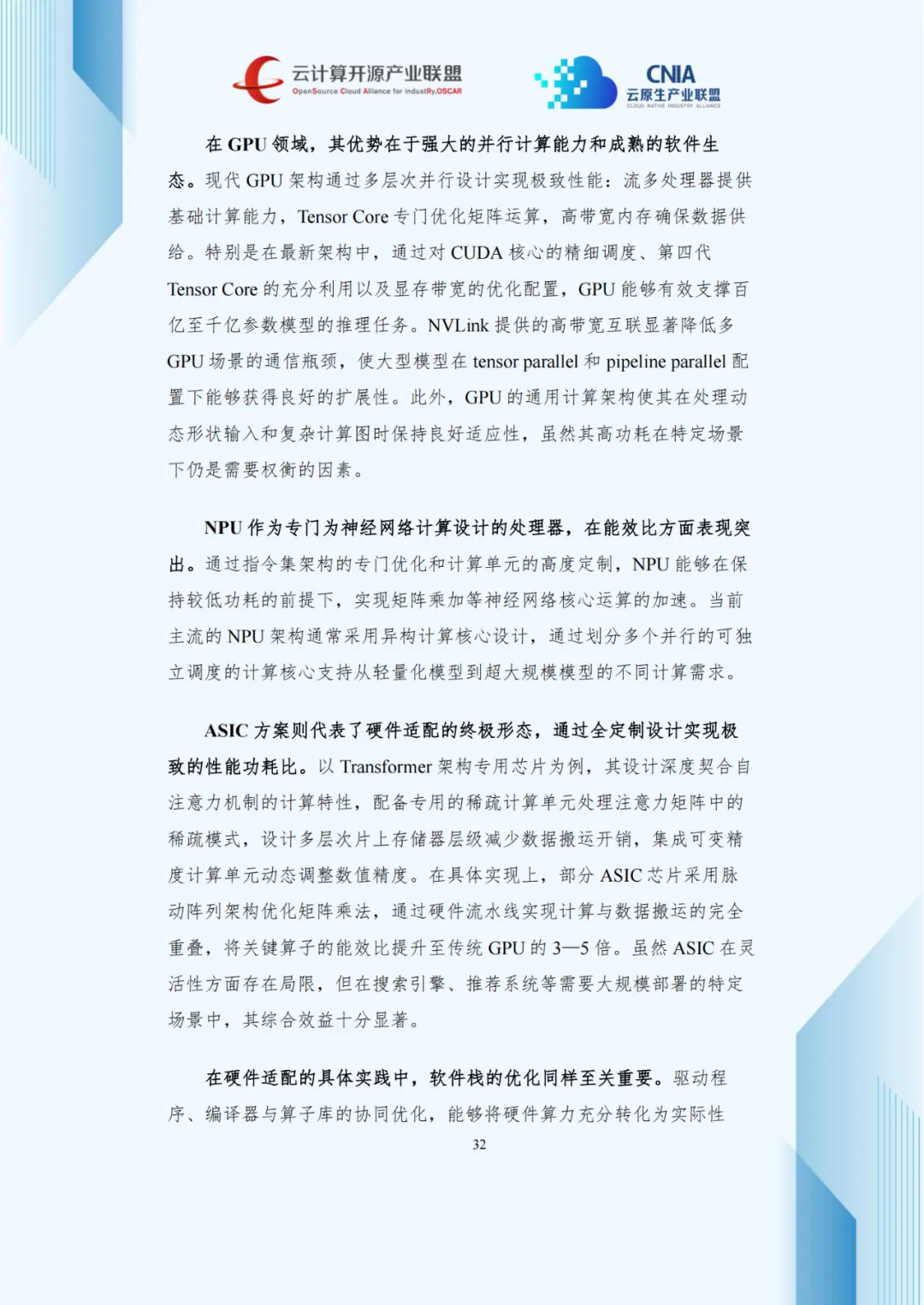 模型规模扩大与场景复杂化推动硬件生态多元化,形成GPU、NPU、ASIC三类架构并行格局。