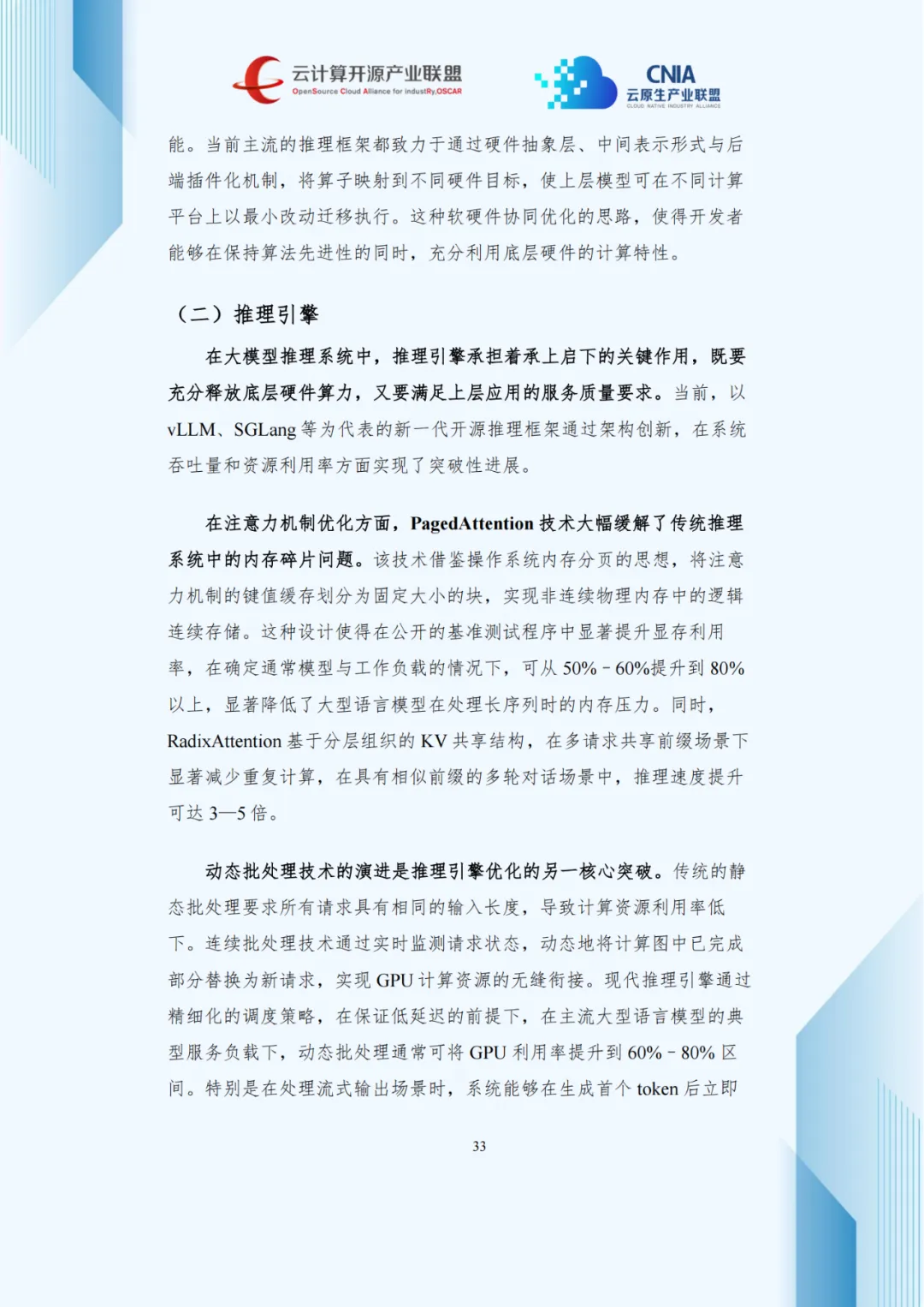 vLLM、SGLang等新一代开源框架通过架构创新提升效能:PagedAttention技术缓解内存碎片,将显存利用率从50%-60%提至80%以上;连续批处理技术动态衔接计算资源,GPU利用率达60%-80%。