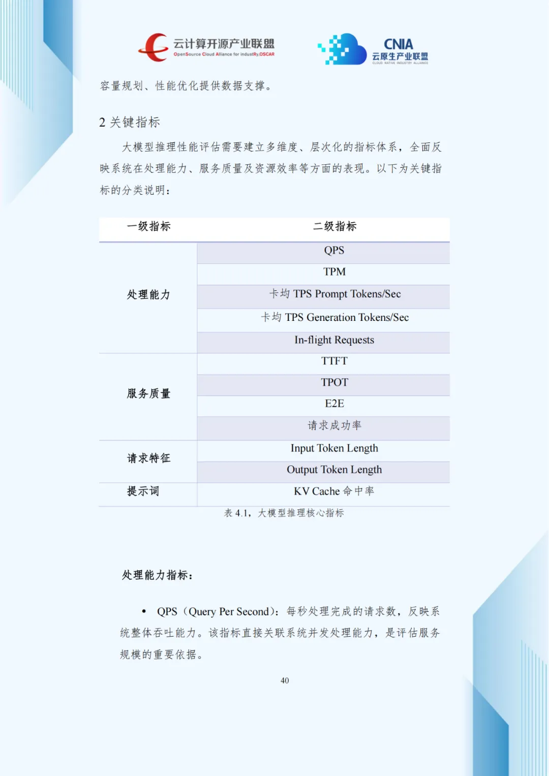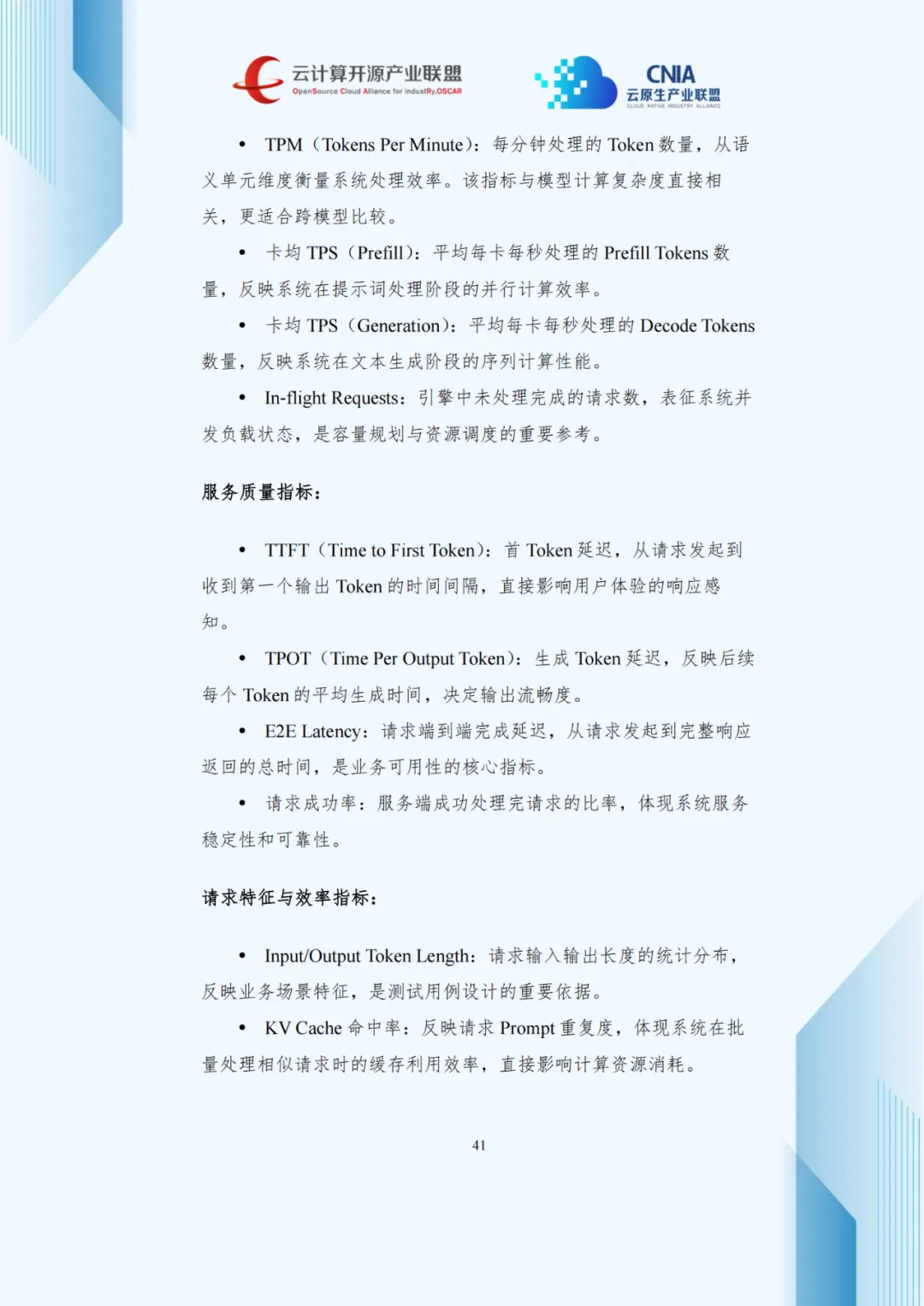 规模化部署推动性能评估标准化,报告提出覆盖处理能力、服务质量、请求特征的多维度指标体系。