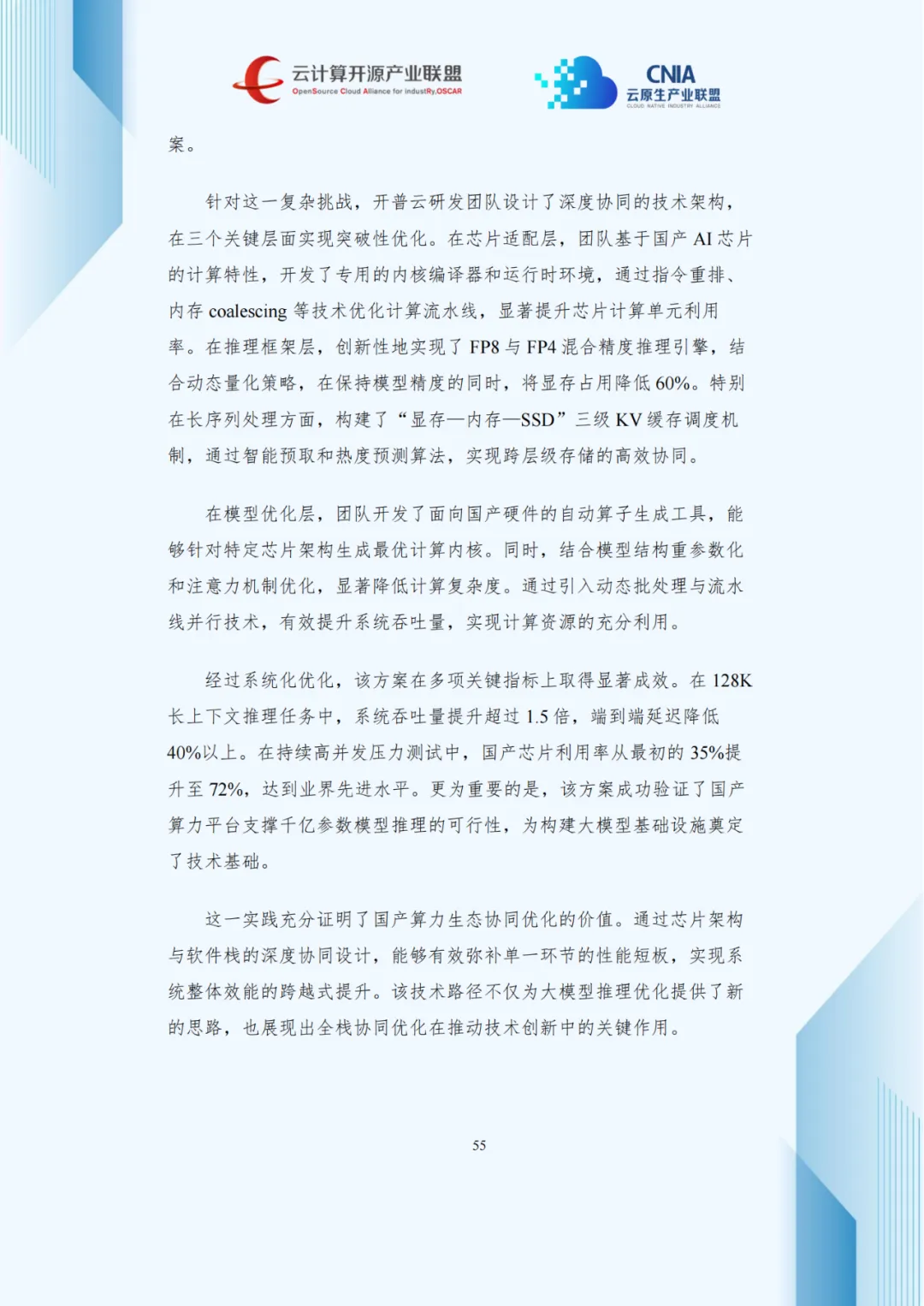 开普云针对国产算力痛点,在芯片适配、框架与模型层深度优化,128K长上下文任务中,吞吐量提升1.5倍以上,延迟降低40%,国产芯片利用率从35%升至72%,达业界先进水平。
