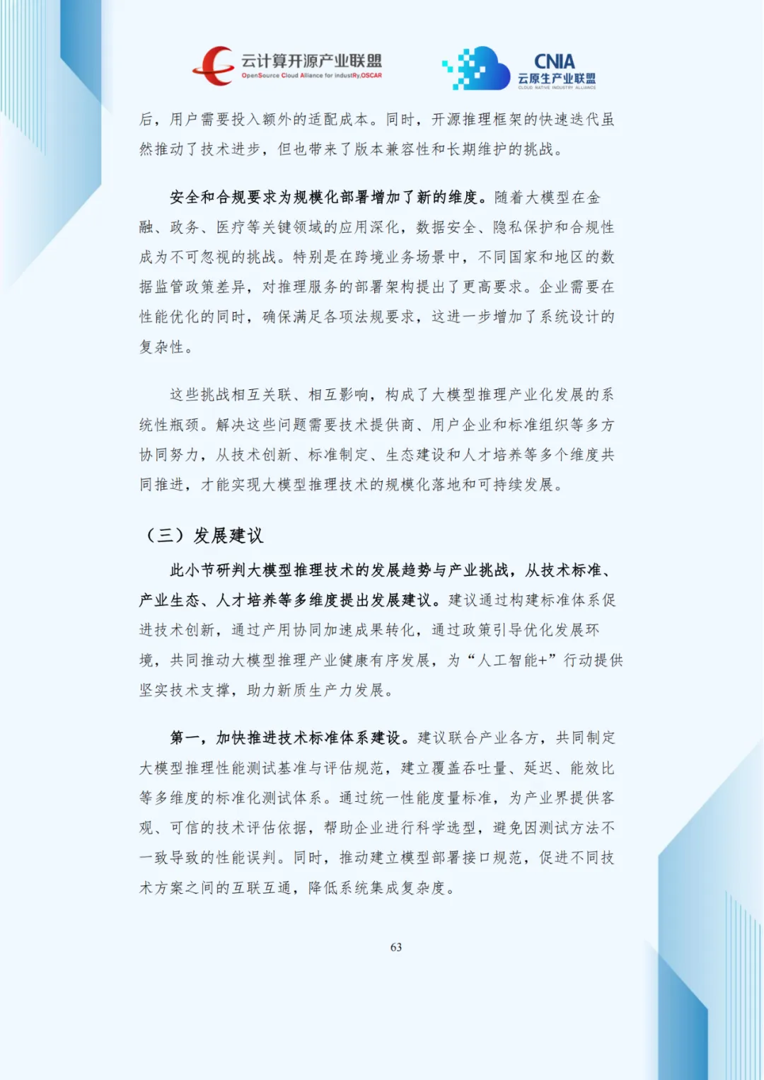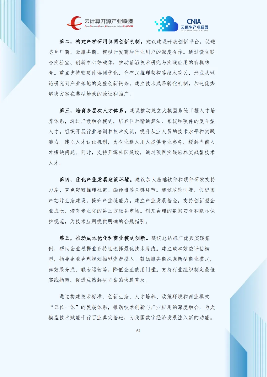 针对上述挑战,报告提出“技术标准—创新生态—人才培养—政策环境—商业模式”五位一体发展建议:加快制定推理性能测试标准;构建产学研用协同创新机制;培养算法、系统、硬件复合型人才;加大基础软硬件研发支持;探索效果分成等新型商业模式,降低企业使用门槛。