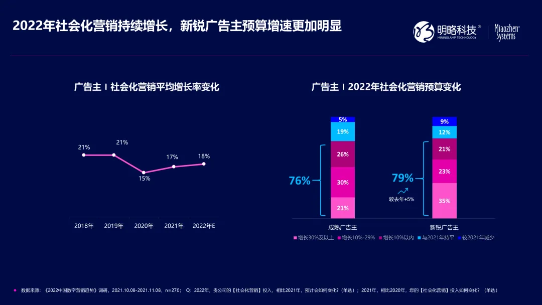 面对当下的新变局,市场情绪总体仍是乐观的:根据秒针的两份报告,50%多的广告主,对2022年的中国营销投入抱有正向信心;但与此同时,《2022 中国数字营销趋势》显示,76%的成熟广告主与79%的新锐广告主都将增加社会化营销的投入,足见对这一块尤为重视。
