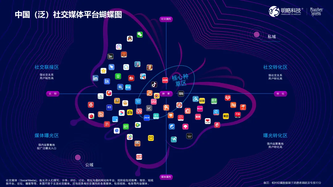 更深层的原因是中国的社交媒体的功能从单一向多元转化。从本次发布的中国(泛)社交媒体平台蝴蝶图上,我们看到中国的社交媒体呈现出融合共生的态势。主流媒体平台正发力种草板块、探索全新转化模式;平台内容正从单一形式到多元融合,呈现内容共生的格局;品牌尝试借助跨行业、多品类的KOL组合,成功破圈、吸引更多人群。