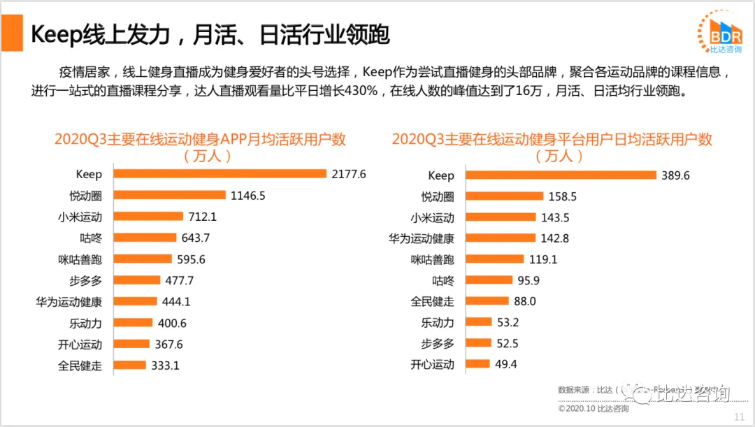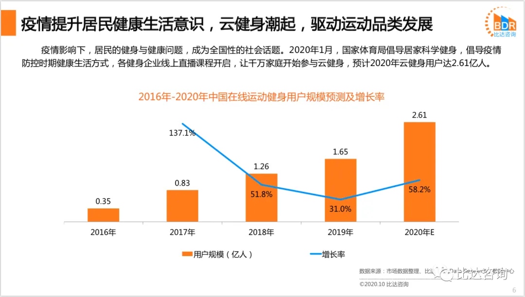 疫情影响下,居民的健身与健康问题,成为全国性的社会话题。2020年1月,国家体育局倡导居家科学健身,倡导疫情防控时期健康生活方式,各健身企业线上直播课程开启,让千万家庭开始参与云健身,预计2020年云健身用户达2.61亿人。