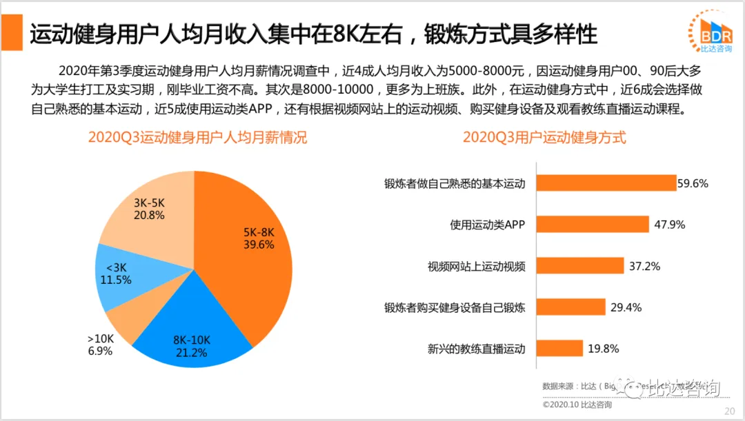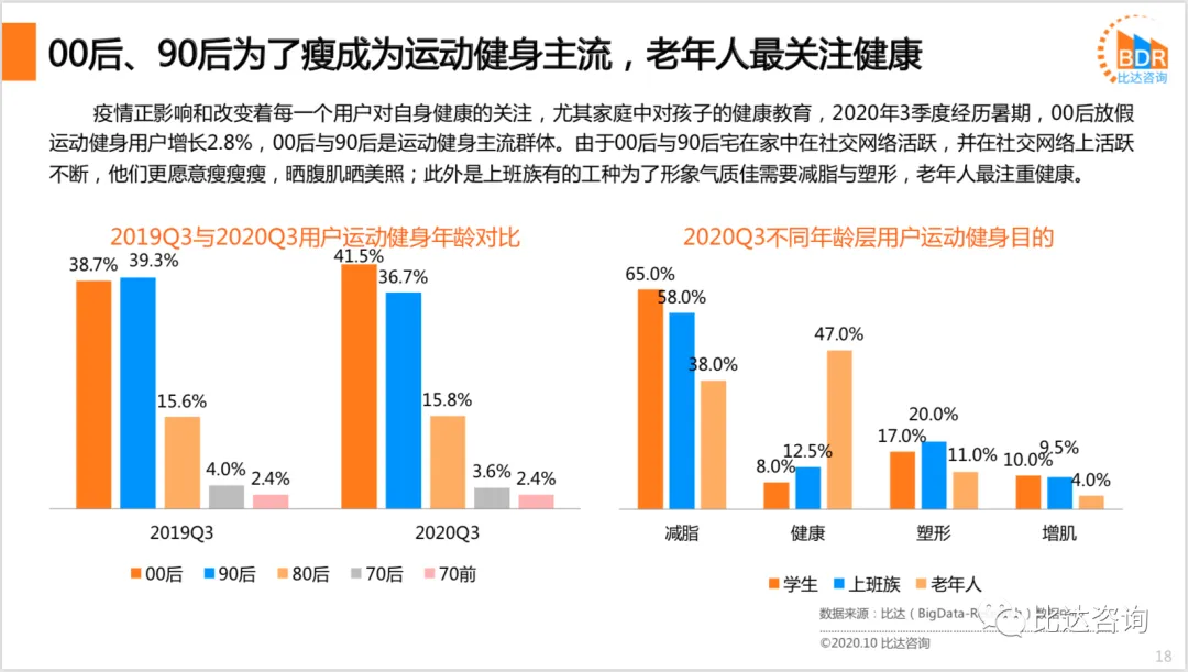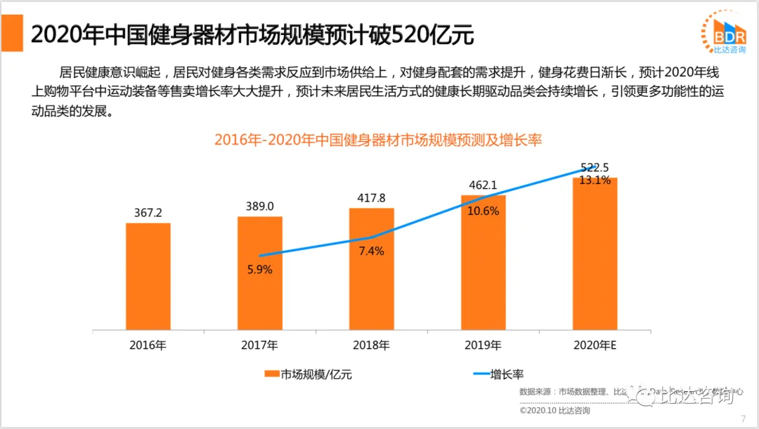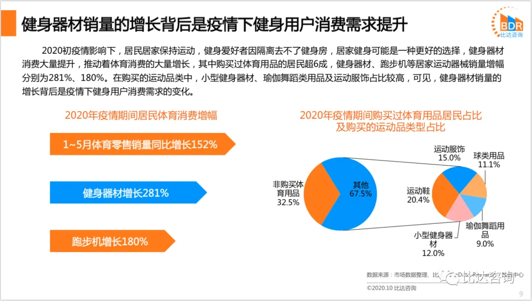 居民健康意识崛起,居民对健身各类需求反应到市场供给上,对健身配套的需求提升,健身花费日渐长,预计2020年线上购物平台中运动装备等售卖增长率大大提升,预计未来居民生活方式的健康长期驱动品类会持续增长,引领更多功能性的运动品类的发展。