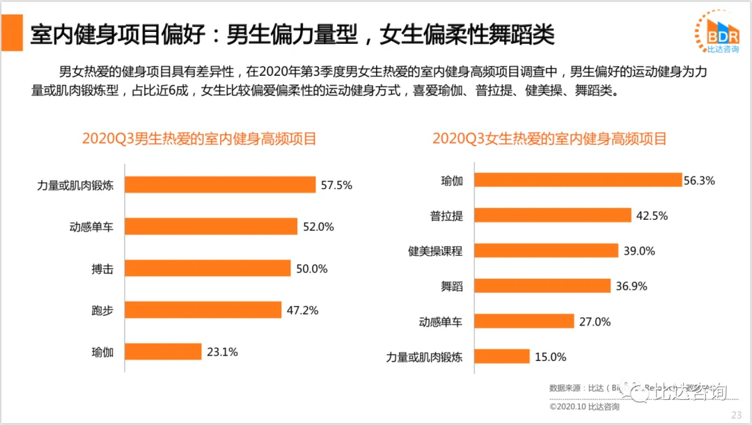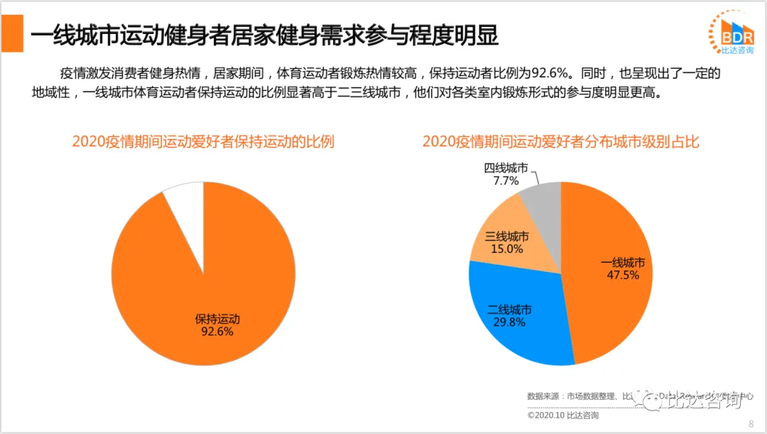 疫情激发消费者健身热情,居家期间,体育运动者锻炼热情较高,保持运动者比例为92.6%。同时,也呈现出了一定的地域性,一线城市体育运动者保持运动的比例显著高于二三线城市,他们对各类室内锻炼形式的参与度明显更高。